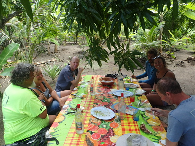 We had lunch at one of the properties yesterday. Wild marinated goat done on the BBQ with bread fruit chips, mango and papaya salad and fresh avocado. Followed by coffee and banana ice cream. Everything from the local vicinity. Washed down with a choice of either lime or pamplemousse juice. Top nosh. Lovely lunch. Although not totally idyllic as a fair number of house flies joined the party too when the food came out.